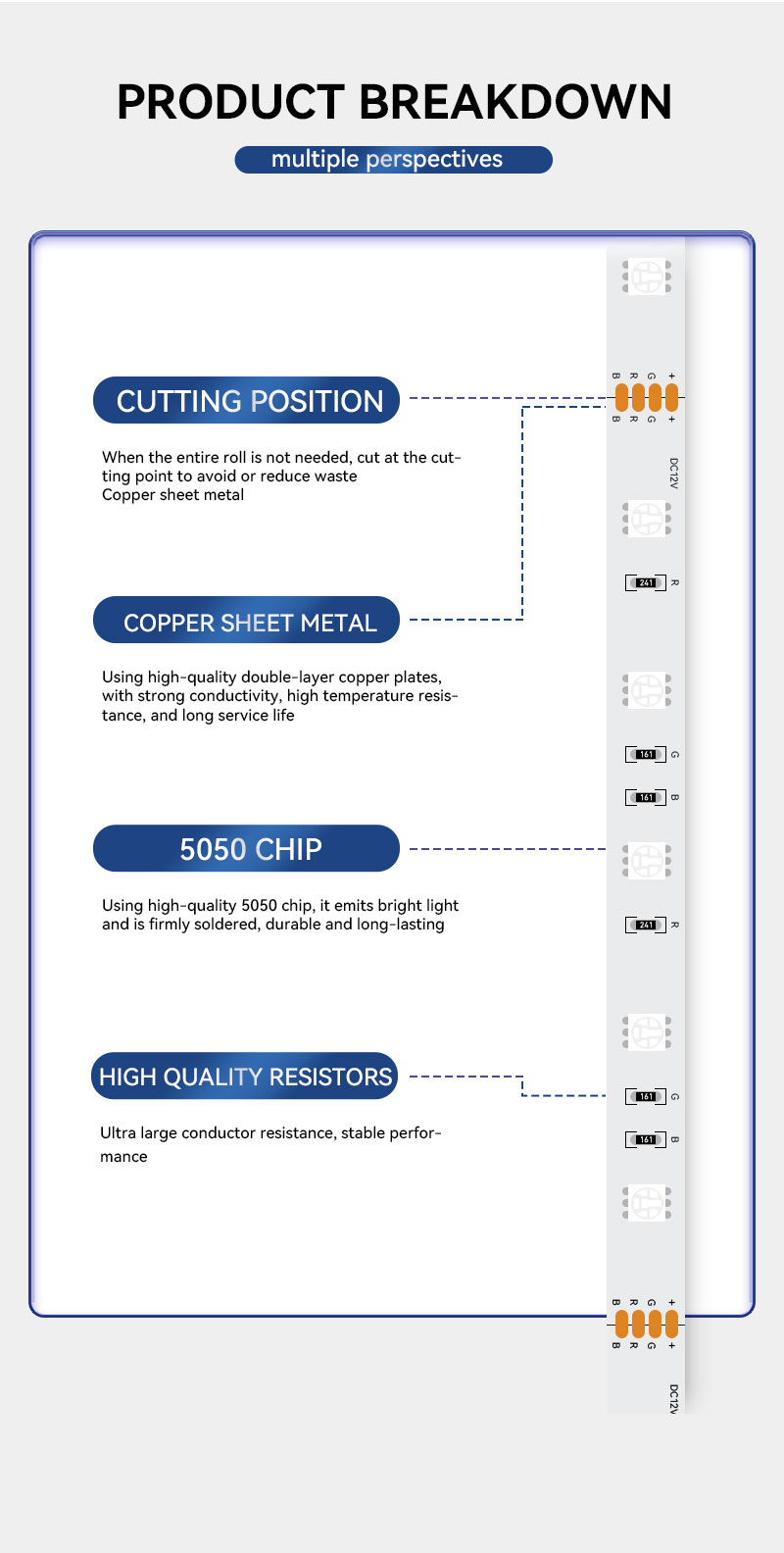 5050 RGB LED 스트립 조명 어떤 환경에도 생동감 넘치고 맞춤형 조명을 제공합니다. 24V 전압과 미터당 30개의 LED로 작동하는 이 LED 스트립은 주거용 및 상업용 모두에서 뛰어난 색상 표현, 부드러운 색상 전환 및 안정적인 성능을 제공합니다.