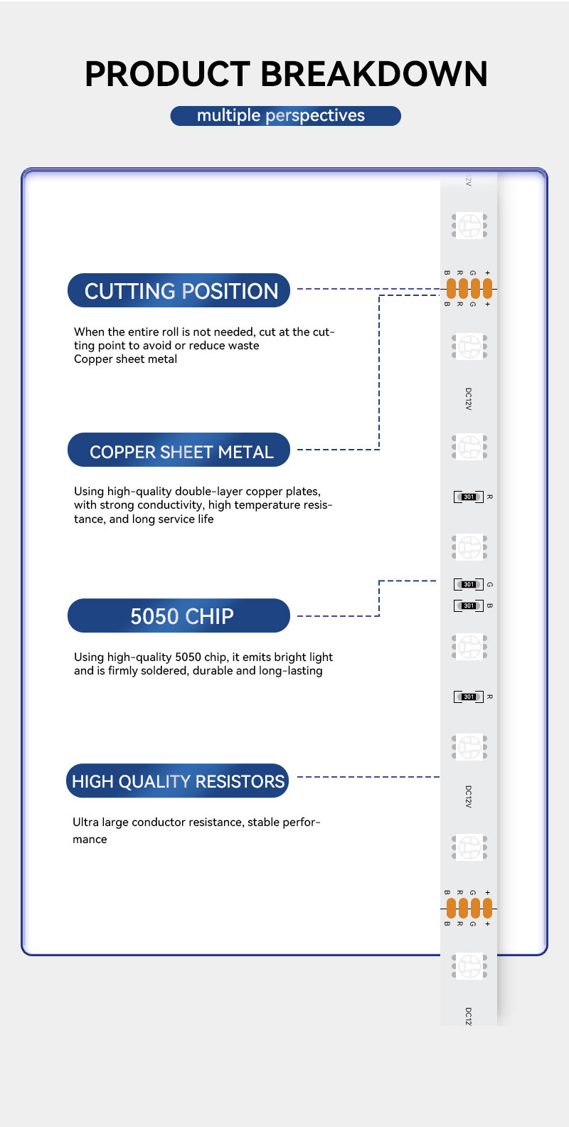 대규모 설치 및 장거리 케이블링 요구 사항을 위해 24V 저전압 DC 설계를 적용했습니다. 12V 제품과 비교하여 24V 시스템은 장거리 설치 시 전류 손실 및 전압 강하를 효과적으로 줄여 스트립 전체에 걸쳐 일정한 밝기를 보장합니다. 두꺼운 이중 레이어 압연 구리 PCB(2oz/3oz 옵션)는 전도성을 향상시킬 뿐만 아니라 탁월한 방열 효율을 제공하여 수명을 50,000시간 이상으로 연장합니다.