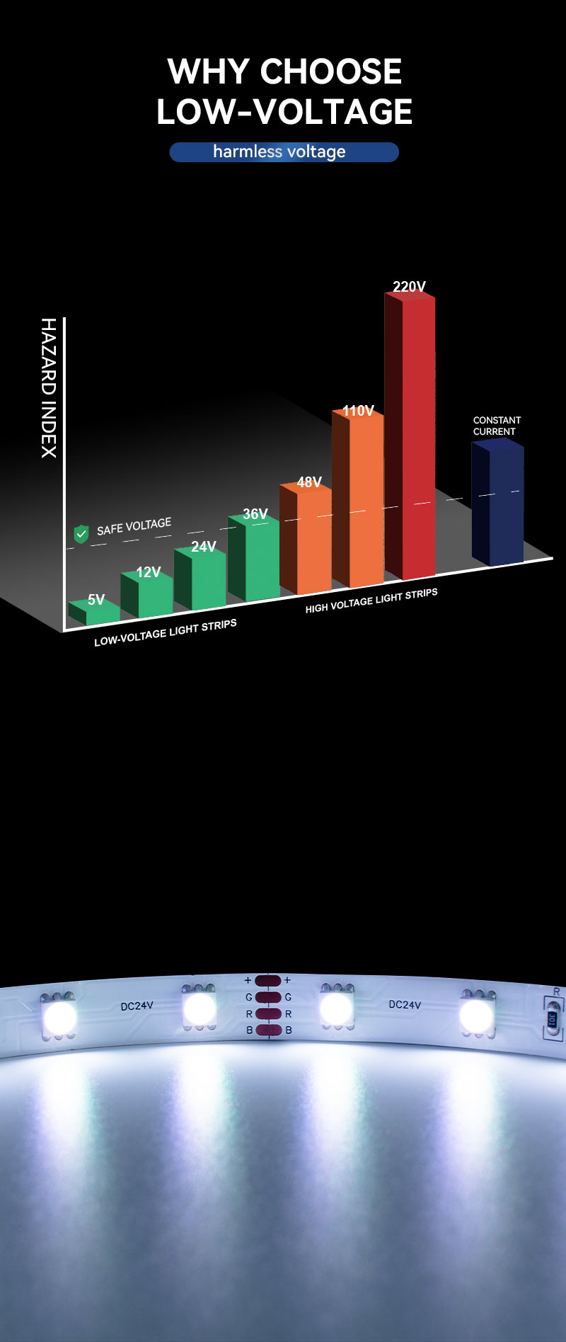 안정적인 24V 성능: 24V 저전압 작동 방식은 전압 강하를 최소화하여 장시간 설치 시에도 안정적인 색상과 밝기를 보장합니다.