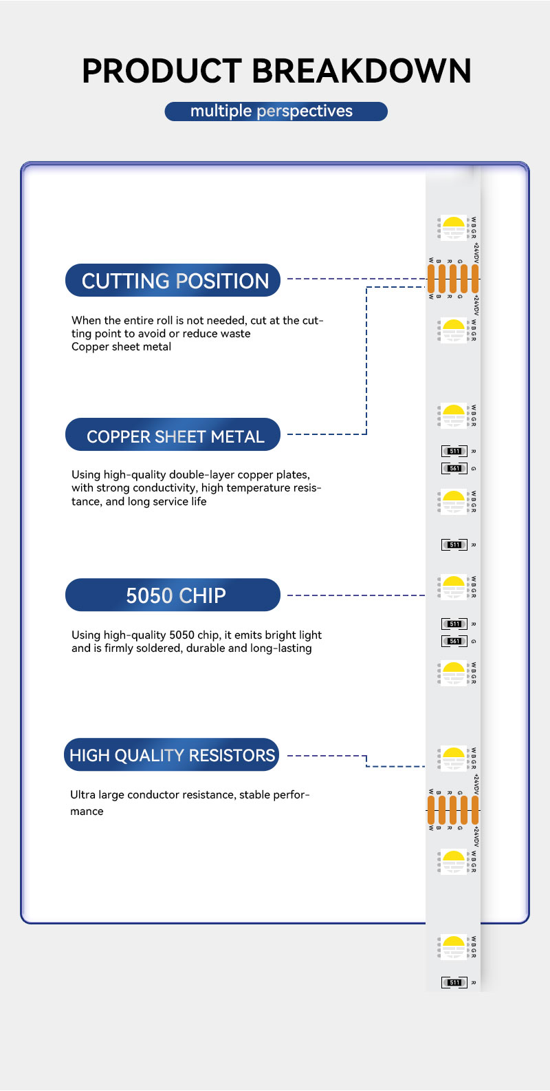 저희 프리미엄 제품으로 조명 프로젝트의 수준을 한 단계 높여보세요. 5050 RGBW LED 스트립 미터당 48개의 LED로 설계된 이 제품은 생생한 컬러 디스플레이와 고품질 백색 조명 모두에 탁월한 밝기와 끊김 없는 조명을 제공합니다. 5.0 x 5.0mm의 컴팩트한 패키지에 통합된 RGBW(빨강, 초록, 파랑, 흰색) 칩은 타의 추종을 불허하는 다용성과 성능을 제공합니다.