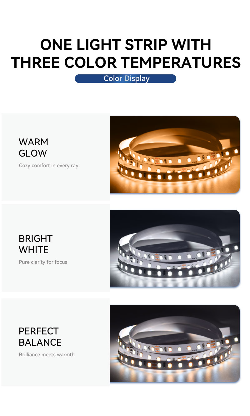 이 듀얼 컬러 온도 고휘도, 고밀도 및 안티 데드 비드 디자인 LED 조명 스트립 강력하고 유연하며 안정적인 조명 솔루션입니다. 충분한 조명을 제공할 뿐만 아니라 필요에 따라 조명 색상을 조절하고 뛰어난 내구성을 자랑하여 현대적인 조명 디자인에 이상적인 선택입니다.